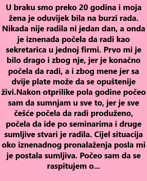 Jednog dana, iznenada, obavijestila me da je dobila posao sekretarice u jednoj firmi. Bilo mi je drago zbog nje. Nije to bio samo posao, bio je to izlazak iz monotonije, prilika da se ostvari u nečemu novom, a uz to i prilika za bolje financijsko stanje. Sjećam se svog entuzijazma, pomislio sam: “Evo, napokon, nakon svih tih godina, stvari kreću nabolje.” U početku, sve je izgledalo kao da ide u pravom smjeru. Pričala mi je o poslu, kolegama, o zadacima koje je učila i o novoj energiji koju je osjećala. Bio sam ponosan na nju, vjerovao sam da ćemo sada zajedno rasti.